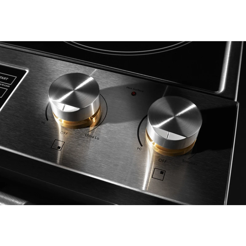 Robust, die-cast metal knobs offer precise control and coordinate with the range’s design.