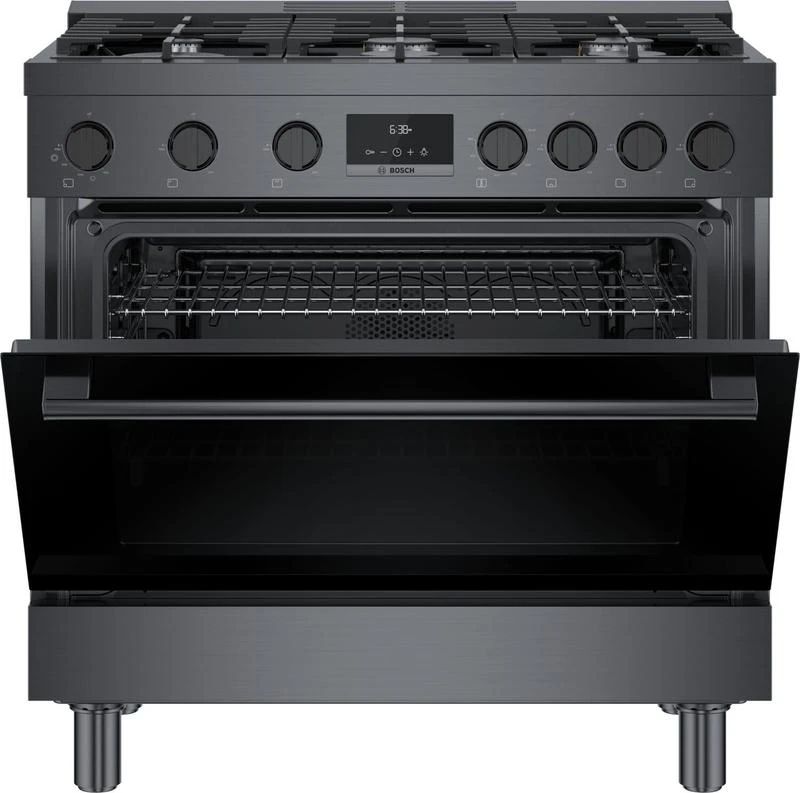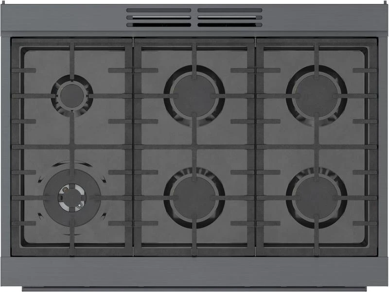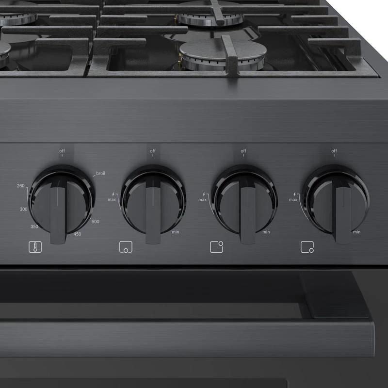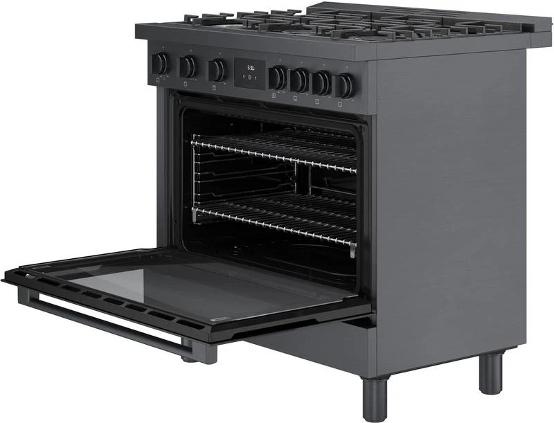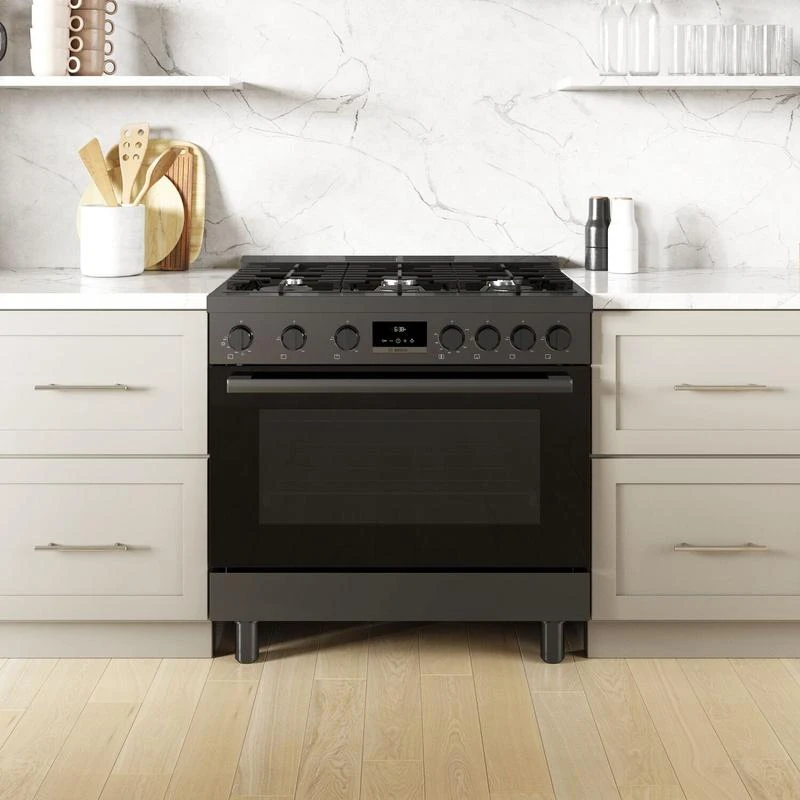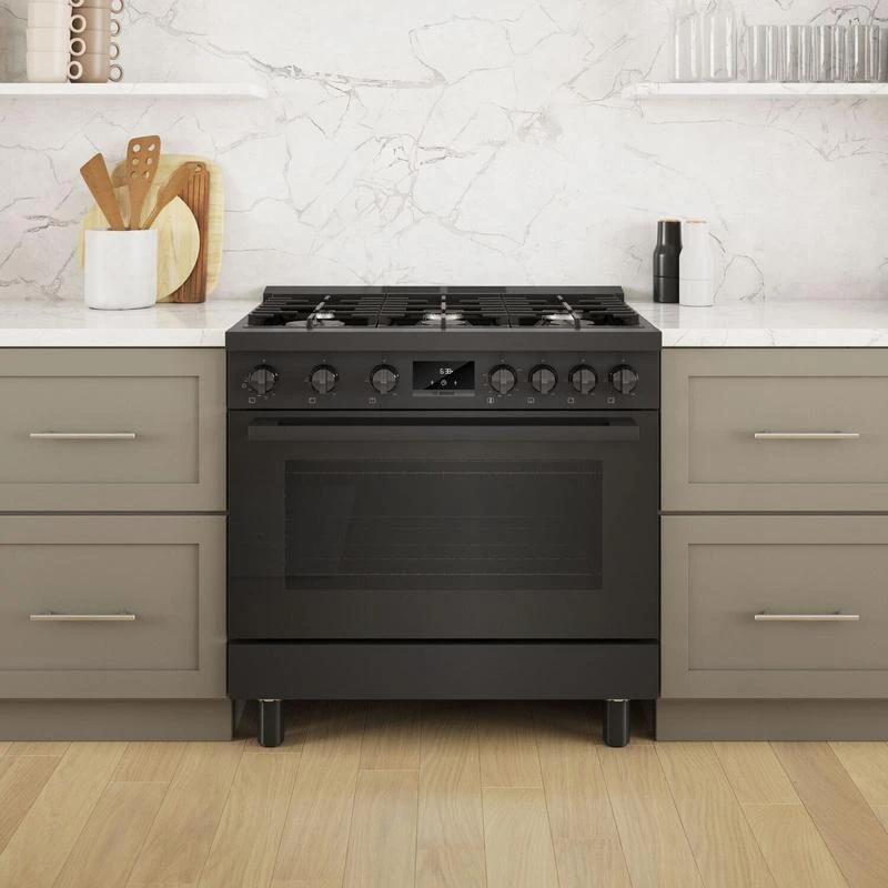 The bold freestanding design with pedestal feet and heavy duty knobs makes the industrial-style range a focal point in any kitchen.