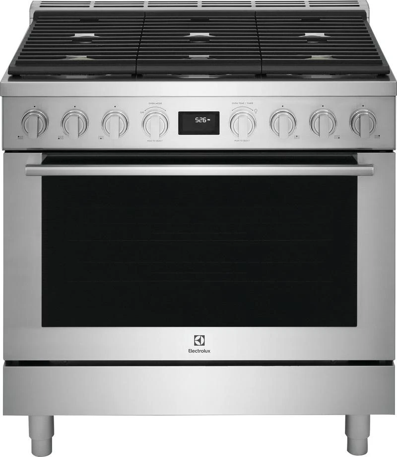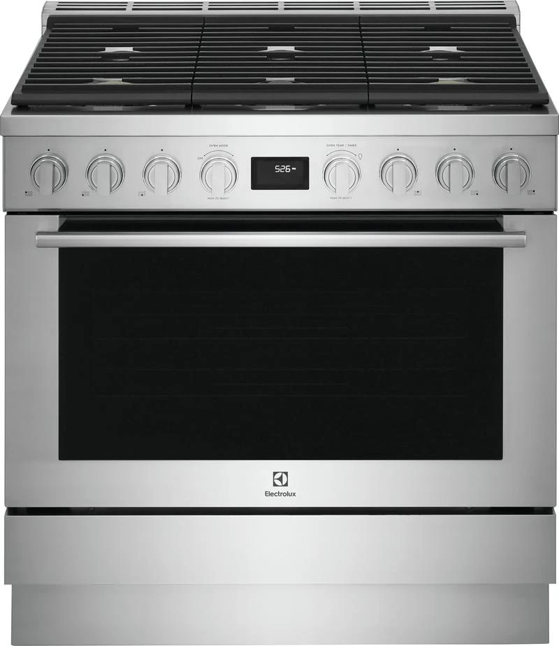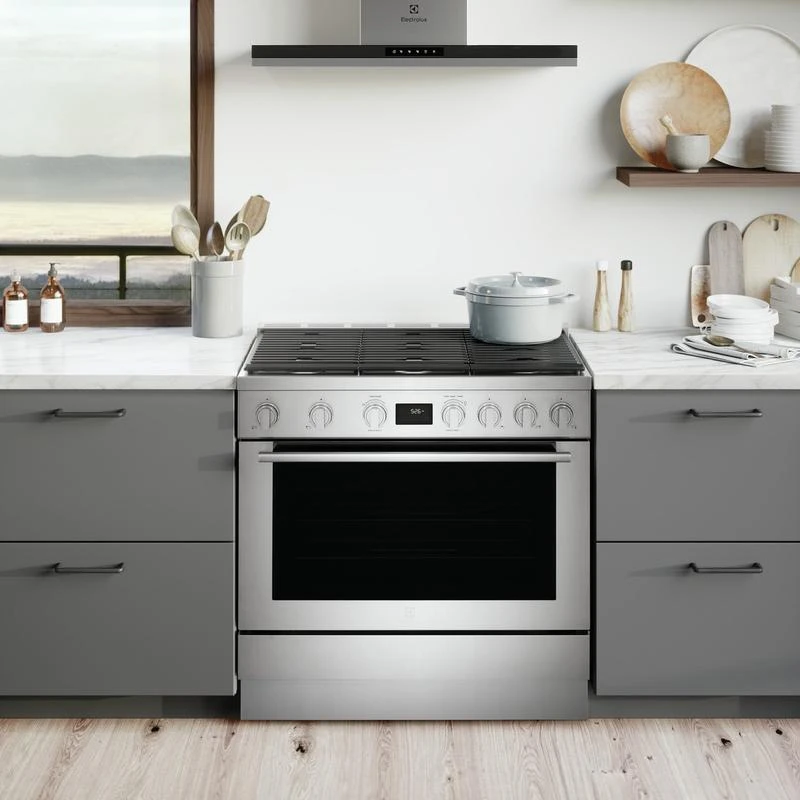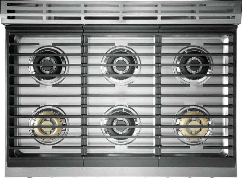 Full-framed linear grates, sturdy knobs, premium brass burner accents and the Electrolux signature pinstriped glass lend to the sleek design that make this range a focal point of your kitchen