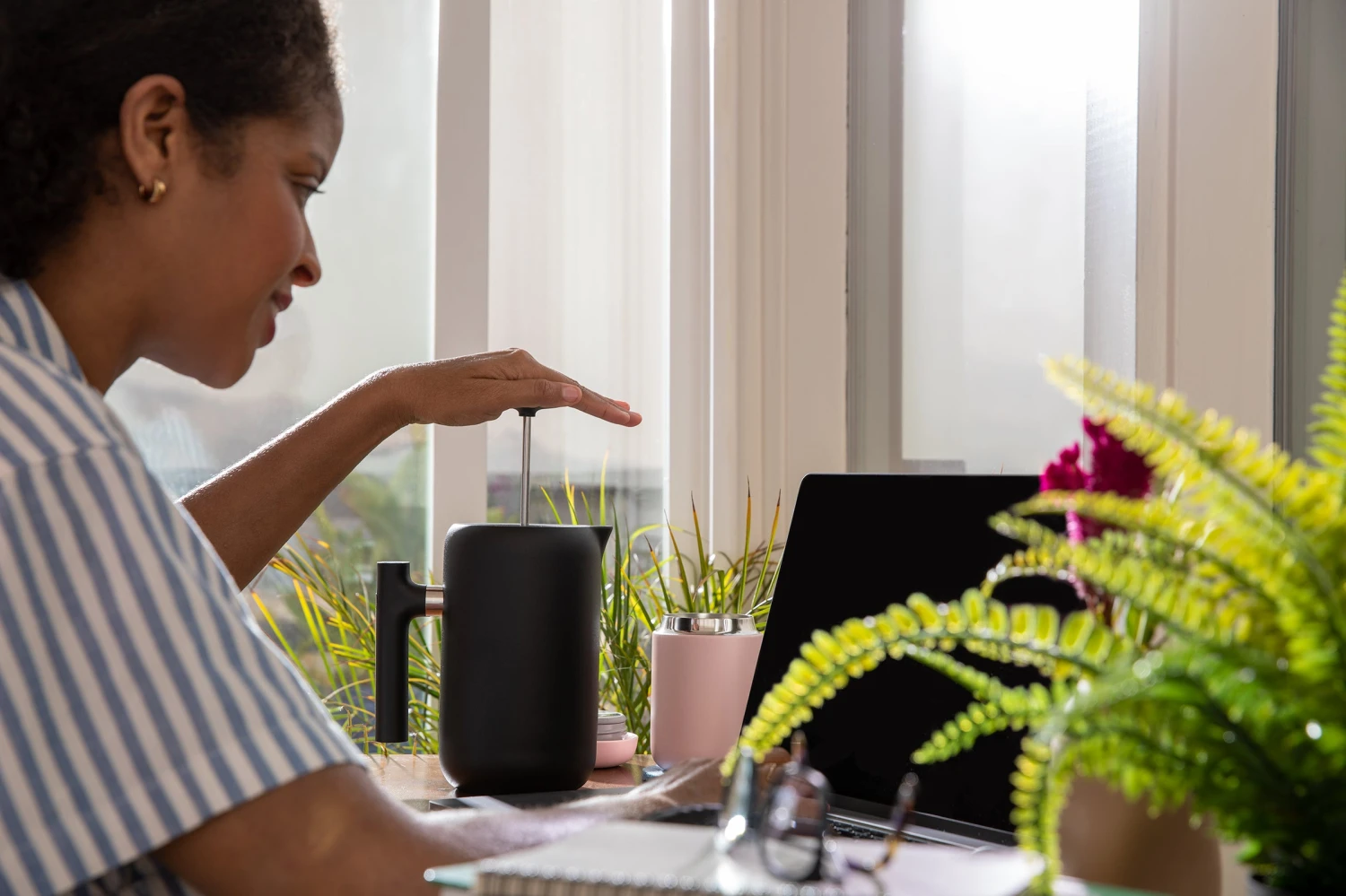 Built with an agitation stick, a built-in coffee and water line, and a minimalist matte black exterior, the Clara French Press has nuanced details that keep the brewing process uncomplicated.