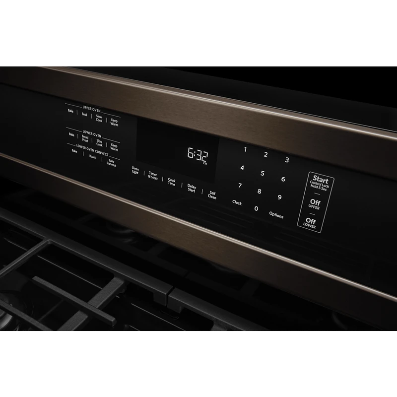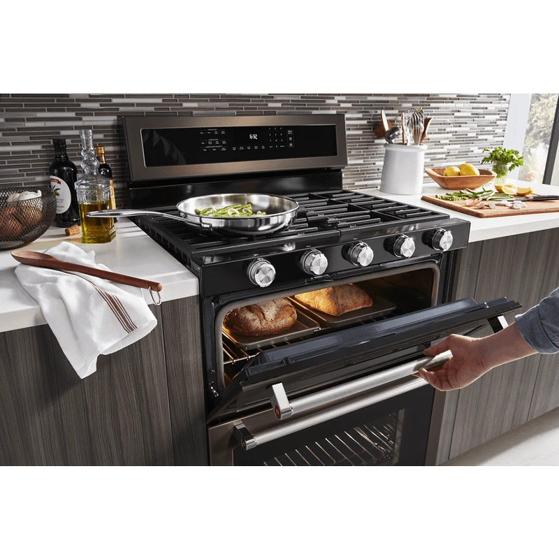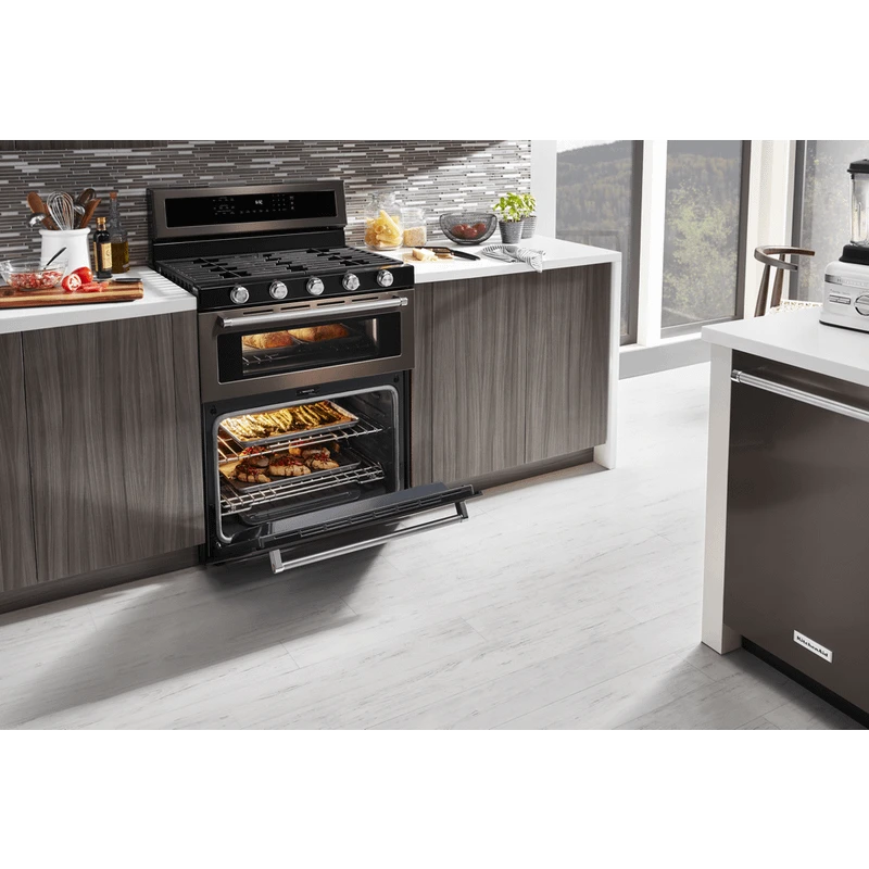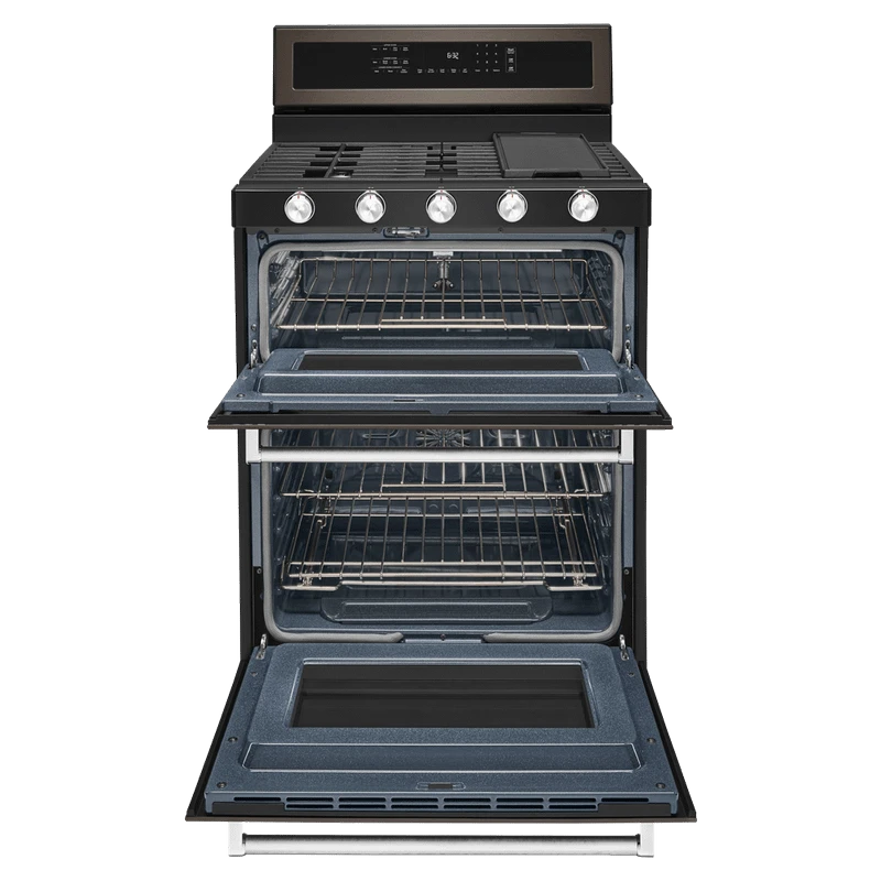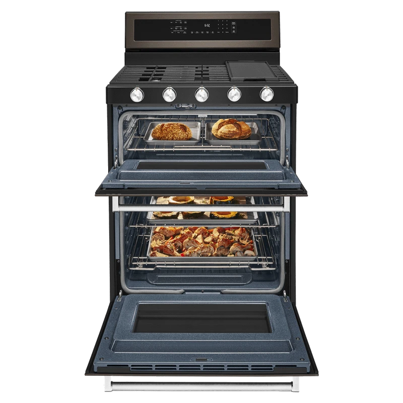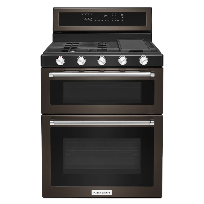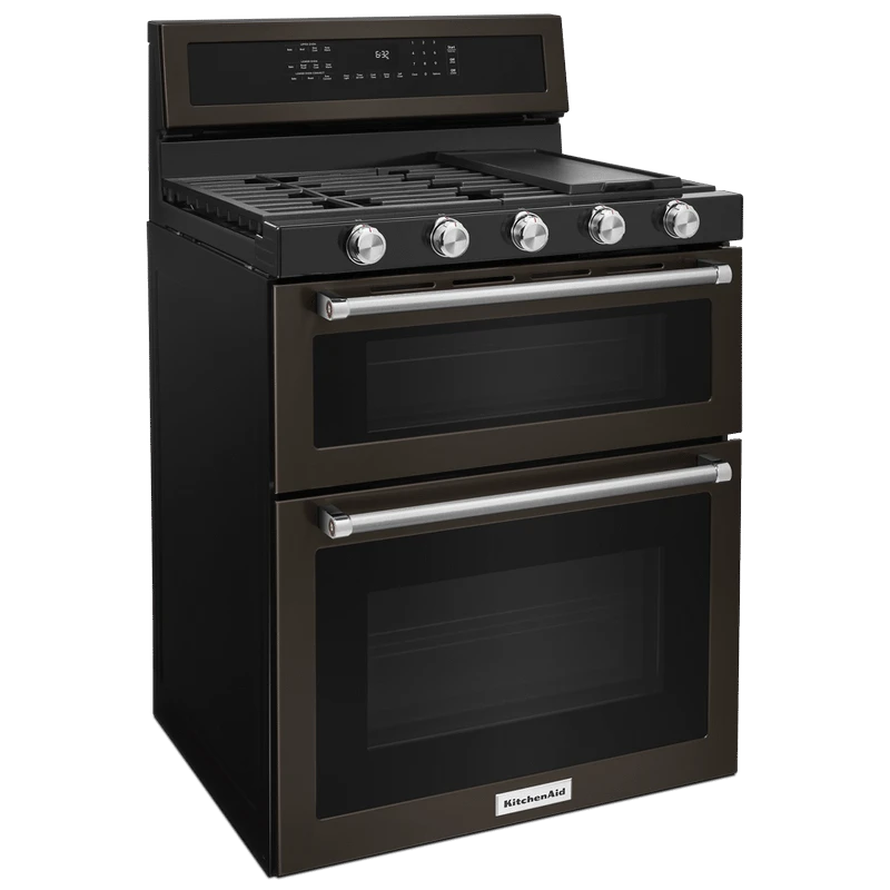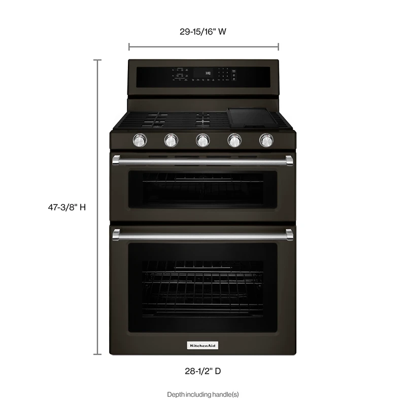 combines a bold blend of professionally-inspired styling with sleek touches for the home. This double oven range features Satin Textured Handles and the KitchenAid® Badge, a symbol of uncompromised quality.