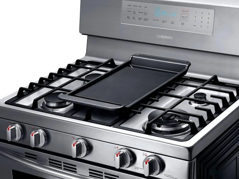 Easily accommodate a round bottom wok on the custom wok grate. Cook a variety of breakfast foods or grilled sandwiches at once on the removable stovetop griddle. A griddle and wok grate is included with each purchase of an NX58F5700 gas range.