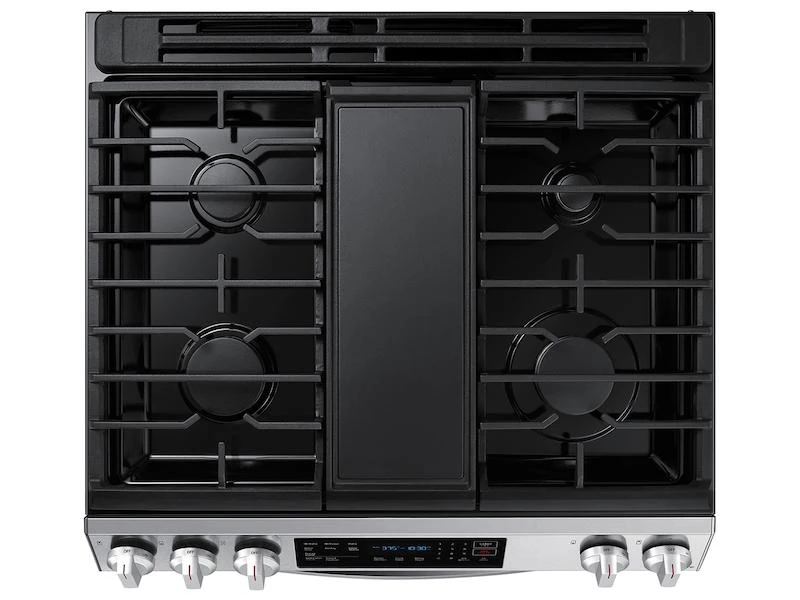 - Flexible 5-burner gas stove with flat-top grate to easily slide pots and pans.